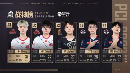 本周NH战队MMing选手和ZpYan1选手分别以31、27个淘汰数拿下战神榜一二名,特别是ZpYan1选手更是以5105的伤害值技惊四座;17战队的Lilghost选手成为队内大腿,以34.1%的得分贡献率排在第三;而黑马STG战队的iL1u选手和Dec12th选手以总计47个淘汰数同样榜上有名。