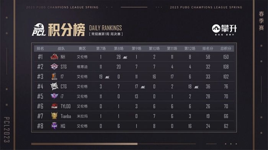 【Krafton Inc.旗下PUBG工作室】逐梦不止,无畏向前!万众期待的2023年PCL春季赛第一周的比赛落下帷幕,NH战队王者归来斩获首周周冠,以150分领跑积分榜;STG战队为本周最大黑马,状态火热,以108分力压17战队拿到第二;17战队则是一如既往的稳扎稳打,以102分拿到首周的第三;此外,CTG战队、TYLOO战队、Tianba战队等老牌战队虽没能像前三名战队那样拿到三位数的积分,但也名列前茅。下面让我们来回顾一下第一周的精彩瞬间吧!
