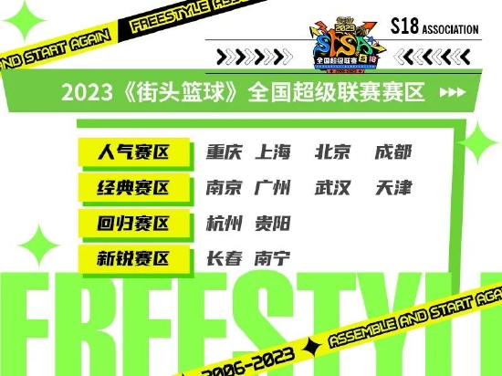 今年《街头篮球》全国超级联赛的赛区分为4种,分别是人气赛区,经典赛区,回归赛区以及新锐赛区。人气赛区是指人气较高的赛区,上海、北京、成都、重庆这4站比赛冠亚军都可以晋级SFSA总决赛,经典赛区经过人气PK留下4个,分别是广州、天津、南京以及武汉。