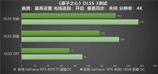 在4K 分辨率设定下,《原子之心》对显卡性能有着较高的要求。通过数据玩家可以看到,在未开启DLSS 3模式时候,影驰 GeForce RTX 4080 星曜 OC 的成绩为91帧,而影驰 GeForce RTX 4070 Ti 星曜 OC则是跑到了72帧的成绩。虽然不是特别高,但是凭借着两张显卡优异的性能,其帧数均是达到了能够流畅运行的门槛。但在DLSS 质量模式的支持下,这俩张显卡均能获得115帧以上的游戏平均帧数体验,享受最佳游戏帧数体验。再看看DLSS 性能模式,成绩也均分别上升到了175帧和141帧。对比帧率涨幅,玩家们可以得到最高95.8的性能上涨。