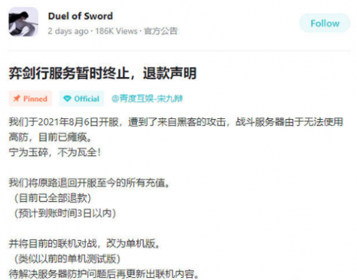 2021年,一款名为《弈剑行》的游戏正式上线,但在开服后不久,游戏的服务器就遭受到大规模的DDoS攻击,开服第二天就面临着服务器瘫痪的问题。在开服第二天的中午,就宣布了将联机对战改为了单机版游戏。