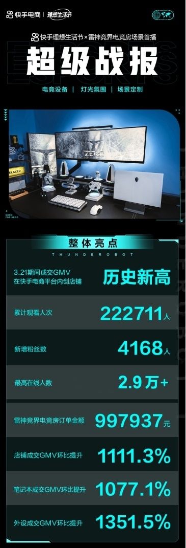 3月23日,快手电商理想生活节联合雷神共同推出雷神竞界电竞房场景首场直播,最终达成GMV近100万,环比提升1111%,创该品牌店铺历史新高。战报还显示,主播间累计观看人次超过22万,最高在线人数超过2.9万,雷神快手账号新增粉丝4168人。