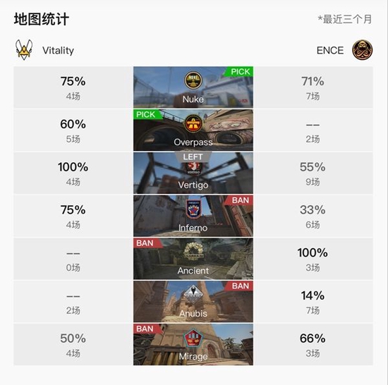 EPL S17淘汰赛八强,等待已久的Vitality迎来了刚刚大胜G2的ENCE。双方互相拿到对方选图之后,在图三Vertigo上展开最后的决战。最终ENCE在图三上半场落后情况下,完成翻盘,晋级四强。