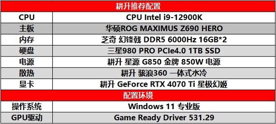 为了能更好的发挥出显卡的性能,本次测试CPU采用了Intel i9-12900K,主板采用华硕ROG MAXIMUS Z690 HERO搭载芝奇 幻锋戟 DDR5 6000Hz 32GB。电源与散热器采用耕升 星源 G850 金牌 850W 电源与耕升 骇浪360 一体式水冷为耕升 GeForce RTX 4070 Ti 星极幻姬持续散热,提升显卡性能。GPU驱动更新为最新的 NVIDIA Game Ready 531.29版本。