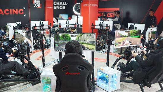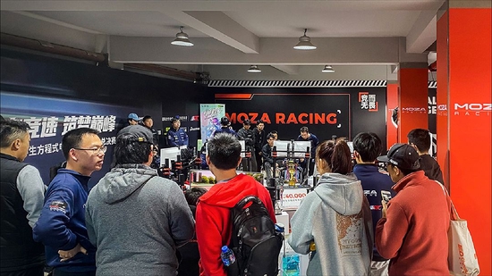 赛场的中心是本次线下总决赛的主要竞技区。10套超高配置的MOZA魔爪赛车模拟器:MOZA R16直驱基座搭配GS方向盘、CRP踏板,配合飞利浦显示器、影驰高性能整机、麦斯电竞耳机及AZRACING座椅支架,环绕奖杯整齐摆放,为今天的比赛提供强有力的硬件支持。