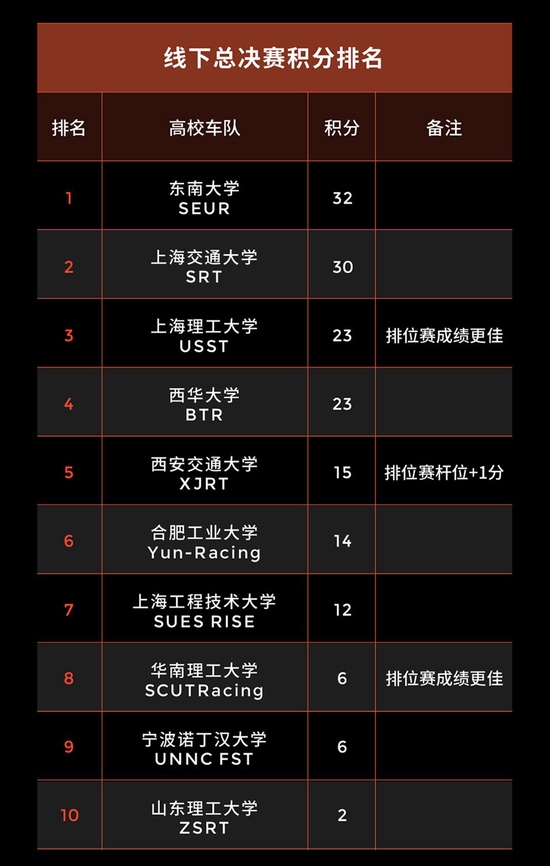 经过两轮鏖战,根据大赛积分及判罚规定,最终东南大学SEUR、上海交通大学SRT及上海理工大学USST分别以总积分32/30/23的好成绩,斩获本次大赛三甲殊荣!他们将获得由MOZA魔爪及一众赞助品牌提供的万元大奖!其余6组参赛队伍也将获得对应的名次奖励。
