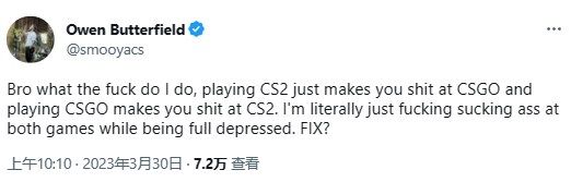 “兄弟们,真该死,我该怎么办?玩了一段时间CS2之后,我打CS:GO就像依托答辩,我再打一段时间的CS:GO,然后再进到CS2里面我又变成了依托答辩。打哪个游戏都很受挫,怎么破?”