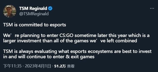 而从Reginald的推特中,似乎部分坐实了之前外媒的报道。那就是TSM有可能会出售LCS(英雄联盟冠军联赛)的特许经营权。不过好消息是TSM还会继续进军CS,但等到TSM进军CS项目,那个时候就不是CSGO了,因为V社预计会在今天暑假发布CS2。