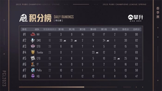 第五比赛日:本日为争冠之日,4AM战队、17战队、NH战队争先恐后,其队伍积分也交替领先,将冠军归属悬念留在了最后一刻。随着第二局CTG战队的吃鸡,17战队以233分排在榜首,仅仅只高出4AM战队两分,而排在第三的NH战队也只是落后17战队4分;同时Tianba战队和TYLOO战队以同样211分队榜首虎视眈眈。而后,4AM战队凭借在倒数第二局的吃鸡成功反超登顶榜首,此时距离夺冠只差临门一脚,好在最后一局的时候,4AM战队以舍我其谁的勇气闯进决赛圈得分,成功超越继承分多他们一倍之余的NH战队和17战队,登顶PCL2023春季赛冠军,可谓是强者造天命!