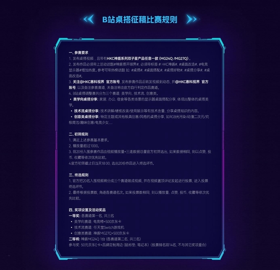 以个人投稿为主,具体请关注HKC各大主流平台官方账号,B站、抖音、小红书平台搜索官方账号ID:HKC惠科视界。顺带一提!本次挑战赛还邀请到了acg外观研究社、银秀疯狂测评、Wallpaper馆主和三人行科技等知名UP主及桌搭达人,为大家“搭”显身手,共同创作更新意美观的桌搭。