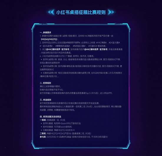 本次挑战赛因为在三个不同平台同步举行,所以规则也略有不同,具体规则如下。小伙伴们也也可以在B站、抖音、小红书平台三大平台搜索官方账号ID:HKC惠科视界,了解具体的规则并参与桌搭活动。