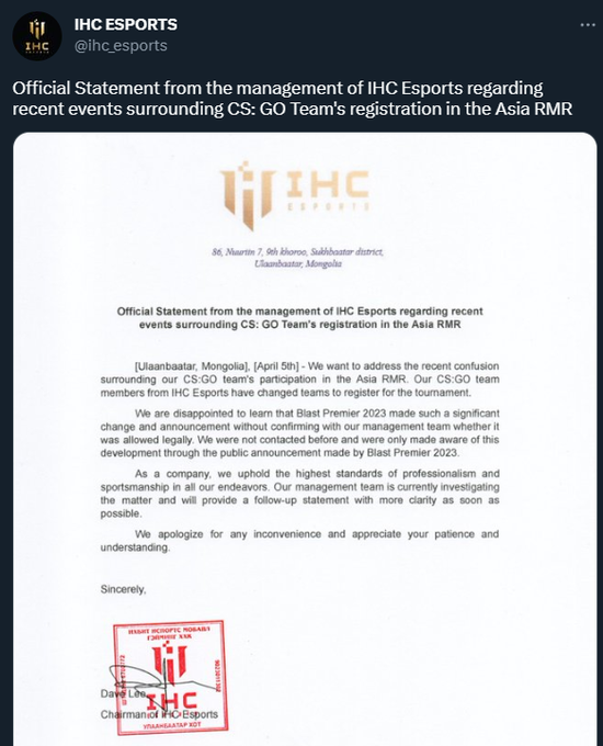 在这份声明中,IHC的主席Dave Lee说:“我们很失望地获悉,BLAST Premier 2023(指BLAST巴黎Major主办方)在没有与我们的管理团队确认是否合法的情况下做出了如此重大的更改和声明。BLAST之前没有联系过我们进行核实,我们也只是通过BLAST Premier 2023的公开声明才知道了这一进展……目前我们的管理层团队正在调查此事,在核实之后将会发表声明。”
