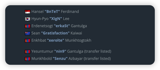日前NKT俱乐部正式官宣了调整后的战队阵容,NKT俱乐部招入了两名新队员,分别是Sean Kaiwai|Gratisfaction和Enkhbat Munkhtogtokh|xerolte。同时俱乐部已经把Munkhbold Azbayar|Senzu和Yesuntumur Gantulga|nin9的名字加入了转会名单之中,并且同教练Machinegun分手。