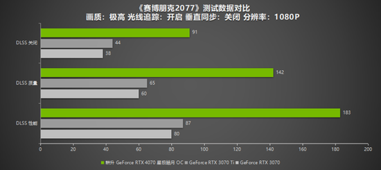 《赛博朋克 2077》是一款光线追踪效果极佳的游戏。在极高画质光线追踪最高的设置下,耕升 GeForce RTX 4070 星极皓月 OC 在未开启DLSS的情况下2K分辨率仅有55帧,而1080P分辨率下达到91帧。但开启DLSS 3模式后,帧数就有了极大提升:2K分辨率下性能直接翻倍获得120帧的光追游戏体验,1080P也同样获得大幅性能提升。达到惊人的183帧,并且在整个游戏过程功率为174W。而RTX 3070 Ti 和RTX 3070在2K分辨率下仅有25帧左右,1080P下仅有39帧上下。由此可见DLSS 3对游戏的性能提升是巨大的,在帧数的提升方面遥遥领先DLSS 2技术。