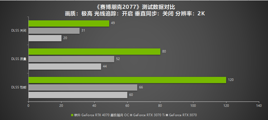 在《消逝的光芒2:人与仁之战》中,DLSS 3的优势更加明显:耕升 GeForce RTX 4070 星极皓月 OC 的DLSS 3“帧生成”模式能大幅提升游戏帧数,在1080P下,DLSS关闭时有77帧;DLSS质量模式时有105帧,DLSS性能模式时有144帧。而在2K分辨率下,性能差距更加明显:DLSS关闭时有57帧,DLSS 质量模式有84帧,DLSS性能模式有110帧。而RTX 3070与RTX 3070 Ti则仅有70帧的水平,在游戏流畅性方面还是DLSS 3 技术略胜一筹。