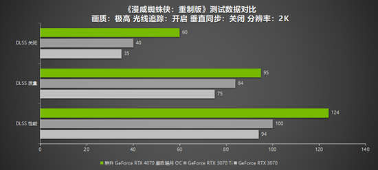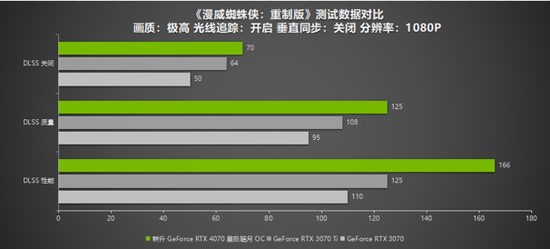 《漫威蜘蛛侠:重制版》作为去年的热门游戏,DLSS 3+光线追踪技术给玩家带来了一场视觉盛宴。在本作中,耕升 GeForce RTX 4070 星极皓月 OC 拥有不俗的性能表现:在1080P下,开启DLSS 3都能跑到124以上的帧数,在2K分辨率下也依然能有120FPS左右帧数,达到完美流畅游戏的标准。而RTX 3070 与RTX 3070 Ti则只有120帧左右帧数,在2K分辨率下下甚至只有90帧左右。