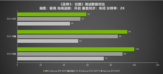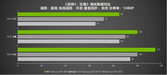 《巫师3:狂猎》作为CDPR的招牌游戏,在去年更新了次世代版本,为游戏增添了DLSS 3与光线追踪技术,为玩家们带来的游戏画面与性能的极大提升。《巫师3:狂猎》次世代版本相较于原版游戏画面画质更加出色,光线追踪的加持让游戏中美轮美奂的景色显得更加逼真。在游戏性能上,耕升 GeForce RTX 4070 星极皓月 OC 在1080P下开启DLSS 3质量模式与DLSS 3性能模式都能达到110帧左右,在2K分辨率下开启DLSS 3性能模式也有100帧,游戏过程中无卡顿与闪退现象出现。而RTX 3070与RTX 3070 Ti 开启DLSS 2则有85帧上下,在游戏性能上DLSS 3的表现更为出色。
