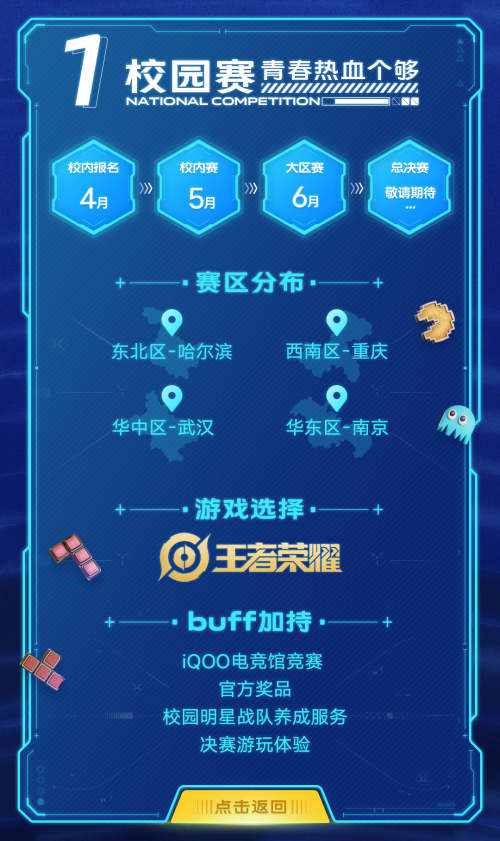 与vivo游戏节官宣同步,iQOO校园赛的赛事报名也于今日正式开启。校园赛选择了在学生群体中广受欢迎的王者荣耀5V5作为主要比赛项目,并将分别在哈尔滨、武汉、重庆和南京等四大城市举行比赛,让高校学生的青春热血尽情挥洒。线下校园赛共分为校内赛、大区赛和总决赛三个赛段,校内赛预计将于5月4日举行,每个赛段都统一采取单败淘汰制。其中,获得各校校内冠军的队伍将有机会在6月上旬参与所在地的iQOO电竞馆大区赛,顺利通过大区赛并取得前三名成绩的队伍即可在7月中下旬的全国线下总决赛中展现风采,角逐冠军。此次游戏节为iQOO校园赛准备的礼品也十分丰厚,每个赛段的前三名都将有机会获得王者周边、游戏皮肤以及500至10000元不等的现金奖励。