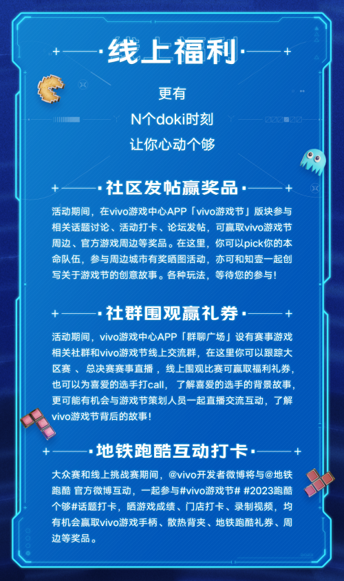 2022年vivo首次举办了电竞赛事,通过与校园电竞群体紧密联动、合作多款手游在上千家vivo和iQOO线下门店开展福利体验、联合五大游戏厂商打造游戏主题快闪店等丰富的活动成功打造了专属于玩家的盛典。今年的游戏则将在去年的丰富体验基础之上,更好地结合线上与线下两个渠道,并向爱好游戏的普通用户提供更多参与机会,发现更多好玩!
