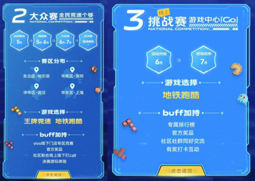 此次游戏节将分别开启iQOO校园赛、vivo大众赛、游戏中心线上赛三条赛道,与王者荣耀、王牌竞速、地铁跑酷三款热门游戏携手,在东北、华中、华东、华南、西南共五个个赛区分阶段举办赛事,通过层层比试的晋级者最后将在总决赛现场同台竞技,共攀vivo游戏中心以及vivo游戏节暑期线下竞技的高峰。