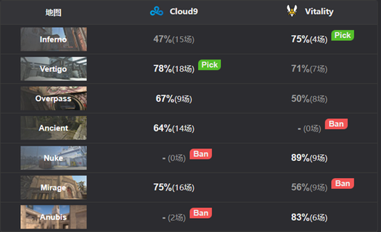 本场比赛的在Cloud9和Vitality之间的胜者将进入决赛。图一sh1ro顶级发挥,1.75的rating让队伍在进攻方不断取胜并赢下图一。图二双方上演了一场相互暴打的大戏,先做进攻方的C9在上半场拿到了12分,而到下半场他们被强行拖入加时并在加时中被击败。图三Vitality在防守方发挥不错,拿到12分,转入下半场,ZywOo逆天的1v4残局让Vitality加速拿到属于他们的胜利。