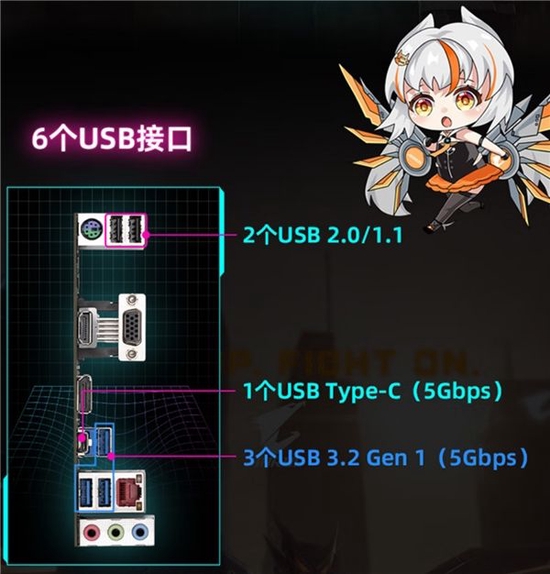 I/O接口方面,主板配备2个USB 2.0和1个PS/2键鼠专用接口,1*HDMI/1*VGA/1*DP视频信号输出接口,1个USB 3.2 Gen 1 Type-C和3个3.2 Gen 1接口,1个2.5千兆高速RJ45网卡接口和3个常见的音频接口。