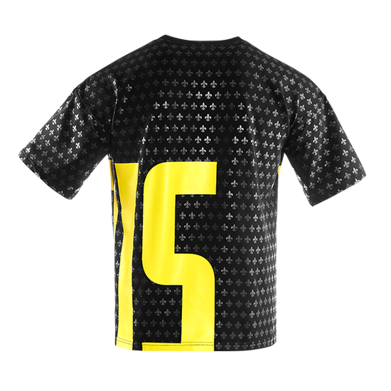 这件T恤的设计非常醒目,黄色、硕大的PARIS字样横亘在衣物的正面及侧面,又用“A”代表了巴黎的地标性建筑——埃菲尔铁塔。黑底上布满了象征法国王室的百合纹章暗纹。
