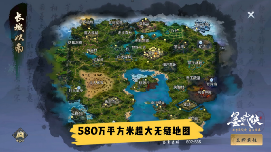 墨武侠和阿尔比恩一样,也拥有超大的无缝地图。墨武侠的游戏地图可用面积大约为580万平方米,这还仅仅是主要游戏场景“长城以南”的大小,新手村,副本和迷宫区域并未计算在内。随着更多区域的开放,墨武侠未来正式版的地图场景只会更加震撼。无缝地图的设定,也保证了玩家之间PVP的畅快体验。