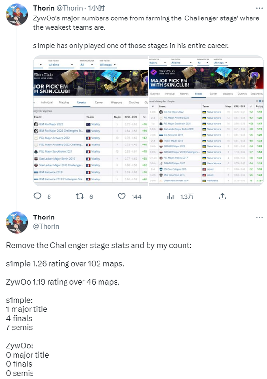 分析师Thorin在社交媒体上分析了ZywOo和s1mple的Major数据,根据他的说法“ZywOo的Major数据主要都来自于弱队林立的挑战者组,而s1mple整个职业生涯只打过一次挑战者组。”