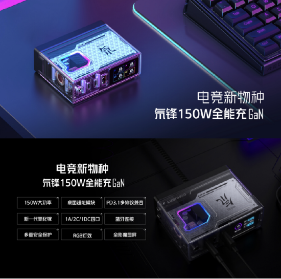 氘锋150W氮化镓全能充GaN作为电竞新物种,炫酷的RGB灯效搭配氘锋透明的外壳,让其机身插电瞬间宛如《创战纪》电影中疾驰赛道的极速光轮。同时150W氘锋充电器拥有四个充电接口,可同时给手机、笔记本电脑、平板等数码设备快速充电,而且用户还能通过机身上的全彩魔显屏实时查看充电状态,无疑是完美的桌搭高手。