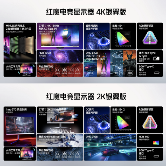 红魔此前推出的全球首款红魔电竞显示器4K版拥有160Hz刷新率、Mini LED 背光技术等高端配置,上市之后获得了用户和媒体的一致好评。27英寸红魔电竞显示器4K银翼版则延续了其顶级功能配置,并采用了氘锋银翼版配色,可完美兼顾游戏、设计、工作等需求。红魔电竞显示器2K银翼版则拥有240Hz极限高刷,适合追求高帧率的游戏玩家。