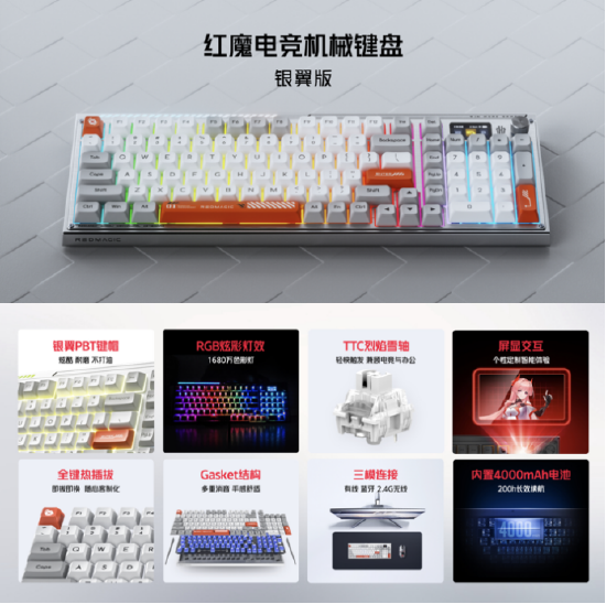 外设方面,此次全球首发的红魔电竞机械键盘银翼版采用了白橙灰三色撞色的PBT键帽设计,配合银色的机身及RGB灯效,给玩家带来舒适的竞技体验。