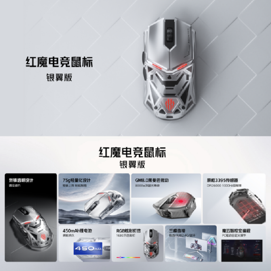 红魔电竞鼠标银翼版的透明银翼配合氘锋镂空设计带来纵深空间感十足的效果,搭配业界最高水准的配置,瞬间拉满电竞氛围。