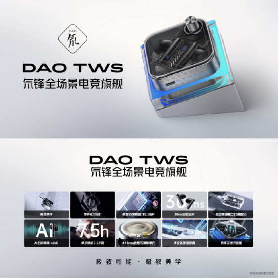 DAO TWS氘锋全场景电竞耳机整体采用了氘锋透明加太空银翼的设计,满满的科技未来感,旋盖结构的镂空孔式设计可DIY成随身携带的潮流配饰。DAO TWS还搭载了高通最新旗舰蓝牙5.3芯片技术,并与高通骁龙联调音效,实现40ms的超低延迟,再加上行业最顶尖48db的ANC主动降噪技术,为用户带来全场景电竞体验。