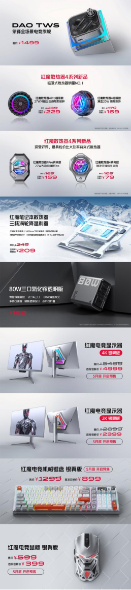 红魔电竞显示器4K银翼版,售价5499元,首发尝鲜价只要4999元,5月底开启预售;红魔电竞显示器2K银翼版,同样将于5月底开启预售,售价2699元,首发尝鲜价仅需2399元;端游电竞装备中的红魔电竞键盘银翼版和红魔电竞鼠标银翼版也将在5月底开启预售,其中键盘售价1299元,首发尝鲜价为899元;电竞鼠标售价599元,首发尝鲜价只要399元。极客玩家喜欢的DAO TWS将于本月上市,售价1499元;氘锋150W氮化镓全能充GaN将于将在6月开启众筹,随后在全球开启销售,大家千万不可错过。