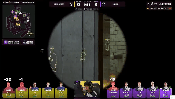 比赛来到上半场第一个长枪局,开局coL选择常规控图,Liquid则是稳健的进行后点防守。没有任何信息的coL打的十分被动,控图完毕的他们再次集合A小选择进攻A区。顶在厕所防守的oSee大狙发挥,打出双杀再次将coL拖住,鸡哥和狂哥补防到位,coL全军覆没。