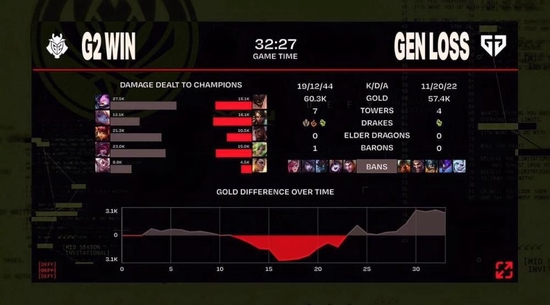 比赛过程则是极其残忍,GEN.G下路早早将G2打穿,不到20分钟便击败GEN.G拿到赛点。