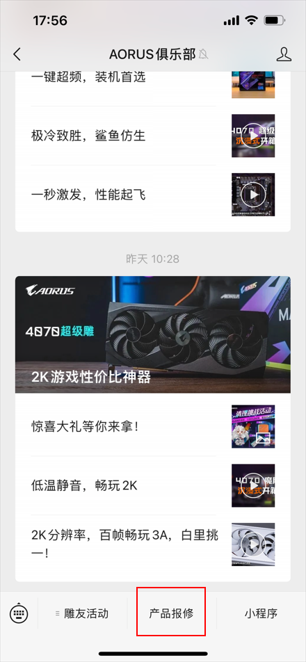 微信搜索并关注“AORUS俱乐部”公众号,选择【产品报修】功能菜单操作申请;
