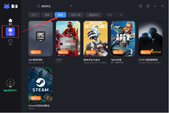 除了绝地求生,还有Apex英雄、Steam、CSGO、Epic领取、三男一狗进行免费加速,只需要点击左边的电脑-限免就可以看到。