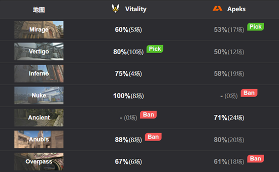 Apeks的进攻十分凶猛,他们总是能找到机会再Vitality的防守阵线中来回穿插,Vitality同样也输掉了多个唾手可得的残局。上半场结束,双方比分来到8-7。