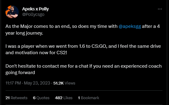 巴黎Major刚刚结束,来自Apeks的助理教练Polly宣布,他已经结束了在主队的工作。