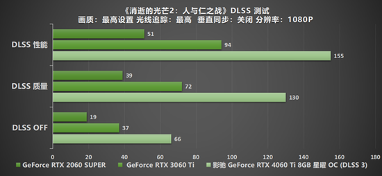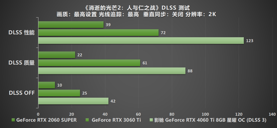 玩家想要使用影驰 GeForce RTX 4060 Ti 8GB 星曜 OC 畅玩2K分辨率下的《消逝的光芒2:人与仁之战》,其帧数仅能稳定在42帧。但是通过NVIDIA DLSS 技术的加持,在DLSS 3两个模式下,分别上涨了109.5%和193%,直白的数据也证明了DLSS 3技术强悍的性能。DLSS 2的加持最高也能够让GeForce RTX 3060 Ti 的帧数达到72帧。 而GeForce RTX 2060 SUPER的性能确实是无法支持其正常进行该游戏了。