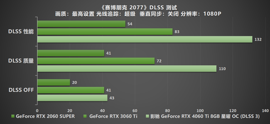 在1080P 分辨率下,影驰 GeForce RTX 4060 Ti 8GB 星曜 OC 的性能让其跑到了43帧的成绩。GeForce RTX 3060 Ti 和 GeForce RTX 2060 SUPER 则分别为41帧和20帧。影驰 GeForce RTX 4060 Ti 8GB 星曜 OC 大幅度的数据提升给与了玩家们在保证精细的画面质量的同时,拥有流畅的动作画面,以确保最优的游戏体验!最高高达207%的性能提升足以见得NVIDIA DLSS 3技术的强悍。而GeForce RTX 3060 Ti 和 GeForce RTX 2060 SUPER 在DLSS 质量模式下分别上涨到了72帧和41帧。而在DLSS 性能模式下更是能达到83和54的成绩。