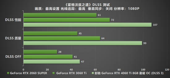 影驰 GeForce RTX 4060 Ti 8GB 星曜 OC 在1080P下即便是没有DLSS 3的加持也可以跑到47的帧数。而开启DLSS 3后则是分别可以达到99帧和107帧的高分。这款游戏,GeForce RTX 3060 Ti 在DLSS 2的加持下也可以拥有良好的游戏体验,帧数最高可以达到72帧。而 GeForce RTX 2060 SUPER 只有在DLSS 性能模式下才能拥有一个稳定流畅的帧数,即61帧。