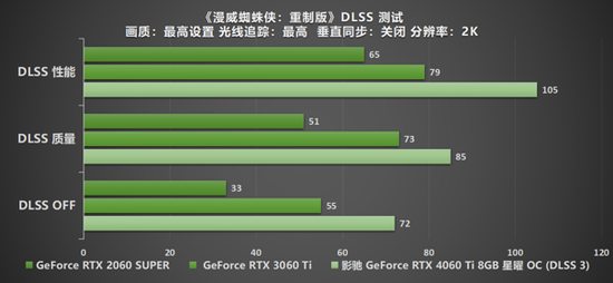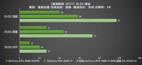 2K分辨率下的影驰 GeForce RTX 4060 Ti 8GB 星曜 OC 的成绩为47帧,开启DLSS 3质量模式后的帧数为64帧,而DLSS 3性能模式下则是拥有了超过100帧的高分。另一边,GeForce RTX 3060 Ti 和 GeForce RTX 2060 SUPER 在DLSS 技术的加持下也能够到流畅运行的门槛,分别为72帧和61帧。