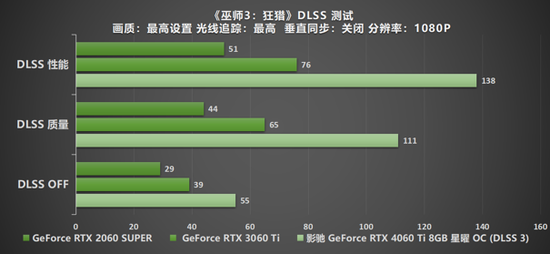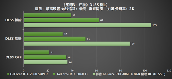 《巫师3:狂猎》对于显卡有着一定的要求,而DLSS 3技术两个模式下的开启配合影驰 GeForce RTX 4060 Ti 8GB 星曜 OC优异的配置,直接将帧数从36帧提升到了88帧和105帧的好成绩。GeForce RTX 3060 Ti 最高也能达到62帧的分数。而GeForce RTX 2060 SUPER 想要流畅运行该款游戏可以说是非常困难了。