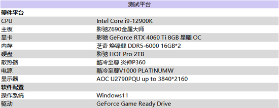 测试环节的平台处理器用到了Intel Core i9-12900k,主板选择了影驰 Z690金属大师主板,内存使用的是芝奇幻锋戟 DDR5 6000Hz 16GB*2;固态上采用了影驰 HOF Pro 2TB。接下来看看影驰 GeForce RTX 4060 Ti 8GB 星曜 OC 这张极品“甜品卡”的性能在测试中会获得怎么样的优异表现吧。