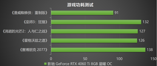 针对以上五款游戏,数据还进行了实时游戏运行功耗对比。影驰 GeForce RTX 4060 Ti 8GB 星曜 OC 的整体平均功耗仅仅为122.8W。其中最低功耗《漫威蜘蛛侠:重制版》仅仅达到91W,而最高的《赛博朋克 2077》也仅仅只达到了138W。驰 GeForce RTX 4060 Ti 8GB 星曜 OC 凭借着全新NVIDIA Ada Lovelace 架构提供动力支持,为玩家们实现了低功耗、高性能的绝佳体验。