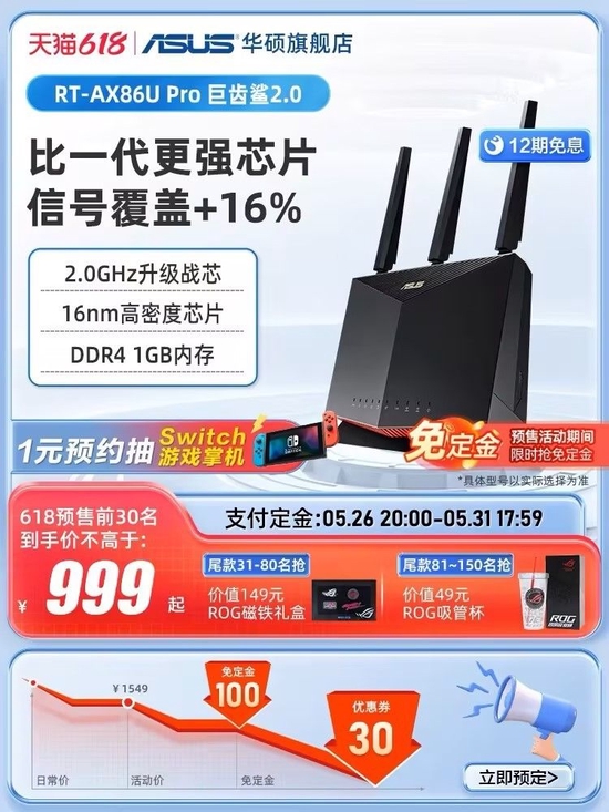 86家族的最新成员华硕RT-AX86U PRO巨齿鲨2.0电竞路由器,叠加天猫618跨店满减、预售免定金、30元无门槛券后的实际预售价格仅为1419元,支付尾款的前30名买家到手价不高于999元,第31~80名和第81~150名可分别获得价值149元的ROG磁铁礼盒及价值49元的ROG吸管杯。当然,12期分期免息的福利也是必须有的。