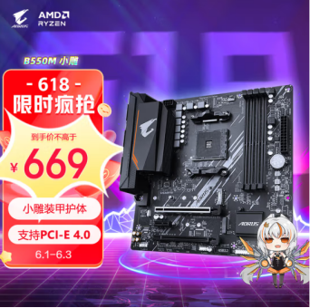 技嘉小雕B550M AORUS ELITE具有良好的供电和散热系统,支持所有主流的锐龙5000系列处理器,并向下兼容2、3000系列锐龙和支持DDR4双通道内存,方便用户根据预算自由组合搭配。支持PCIE4.0显卡和SSD,并配备了DVI、HDMI双视频输出和千兆有线接口,各式功能应有尽有。618年中钜惠期间售价仅需669元可叠加优惠,同样提供4年质保和个人保修直送服务,买到就是赚到。